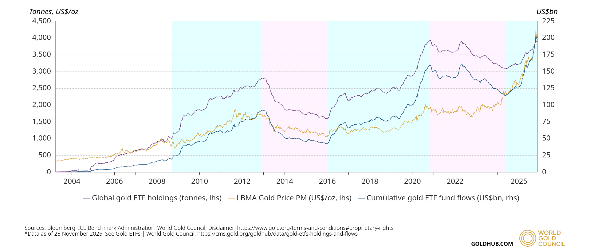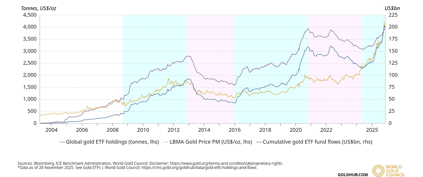 Just to provide a perspective in terms of how much current global etf gold holdings are in terms of tons, it is around 4000 tons with global demand hitting 800 tons from Q4 2024 to Q2025. This is about the same amount of gold holdings than it was back in 2020 as we can see below in the chart.