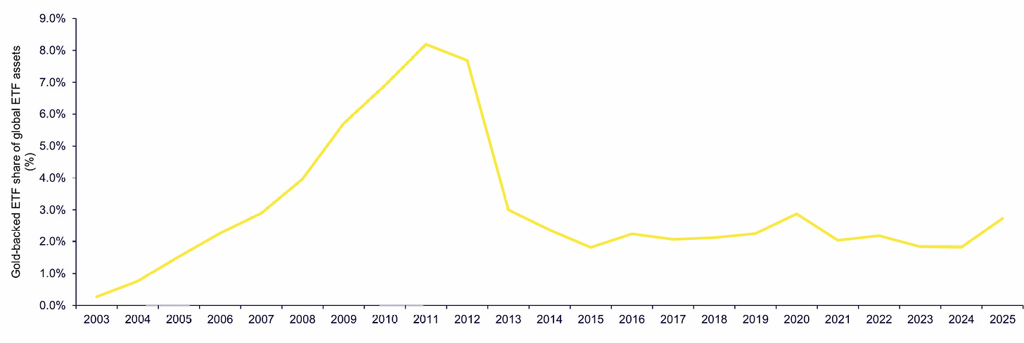 Secondly, we have to acknowlege the Allocation Gap. Since as of December 31, 2025, gold-backed ETF assets accounted for only 2.8% of total global financial assets. This is significantly lower than the nearly 9% allocation seen during the 2011–2012 Global Financial Crisis and remains below the peak levels reached during the 2020 pandemic.