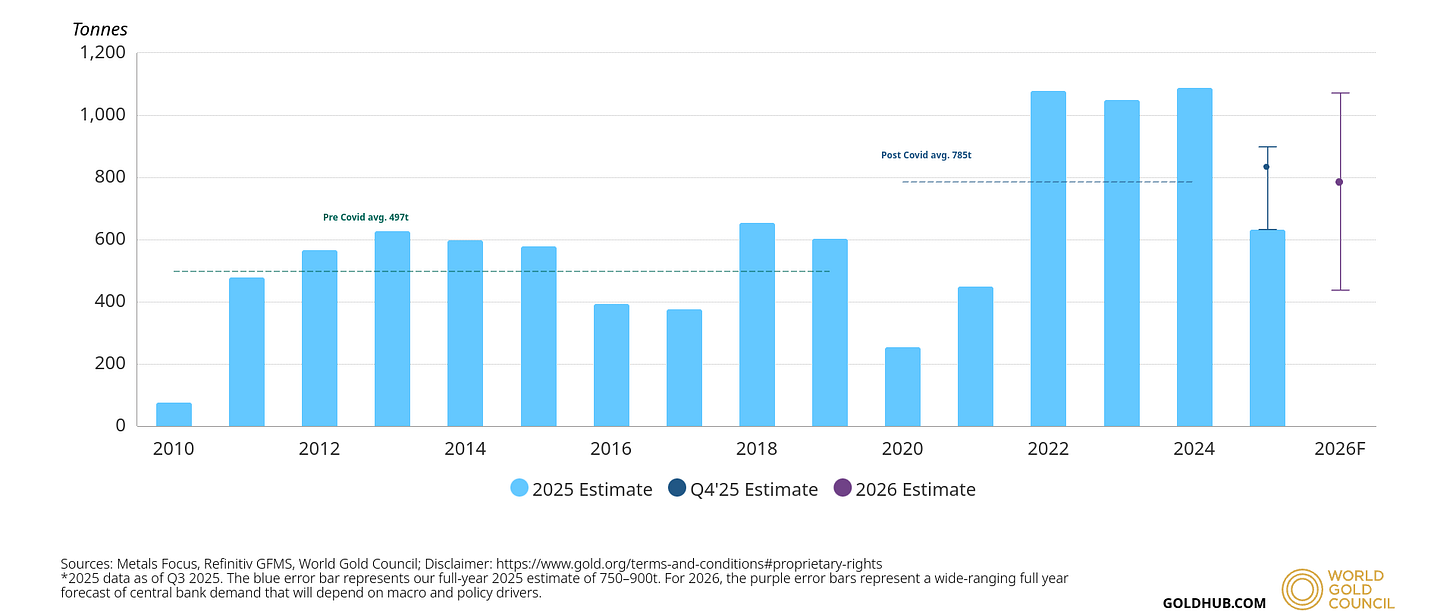 Central banks keep buying and buying, with Record Accumulation. After adding more than 1,000 tonnes annually from 2022 through 2024, central banks remained historically active in 2025, purchasing approximately 863 tonnes despite record-high prices. In 2026 the outlook is for approximately 800 additional tonnage to be bought by Central Banks.