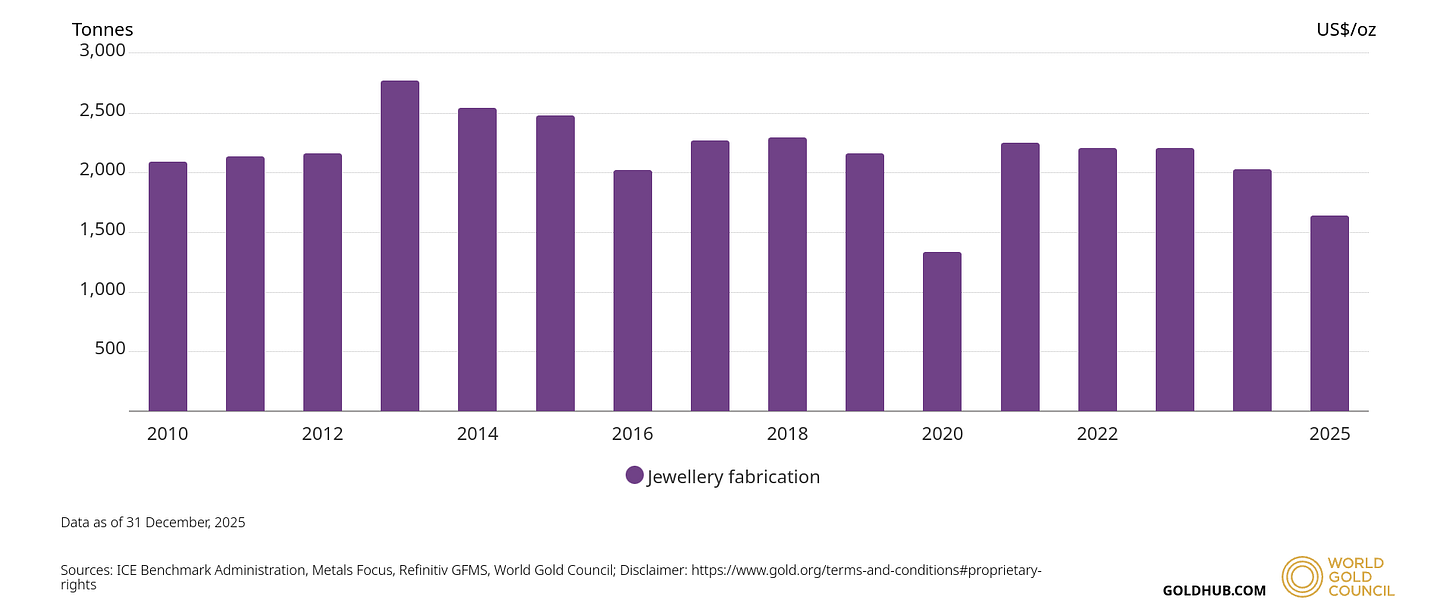 As gold prices reached unprecedented heights throughout 2025 and early 2026, the jewelry sector has experienced a sharp structural cooling. This is a classic example of price elasticity. In 2025, global jewelry demand volumes fell 18% to approximately 1,542 tonnes - which is still about 30% of yearly demand so a important part.