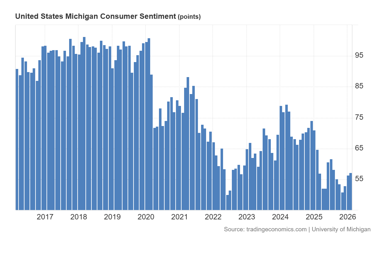 We ended the week with a modest sentiment beat. A reading of 57.3 is better than the expected 55, but let’s be realistic: historically, these are still recessionary levels. Consumers are slightly less pessimistic than last month, likely buoyed by stabilizing inflation, but they certainly aren’t euphoric. The “vibecession” lingers, even if it’s thawing.
