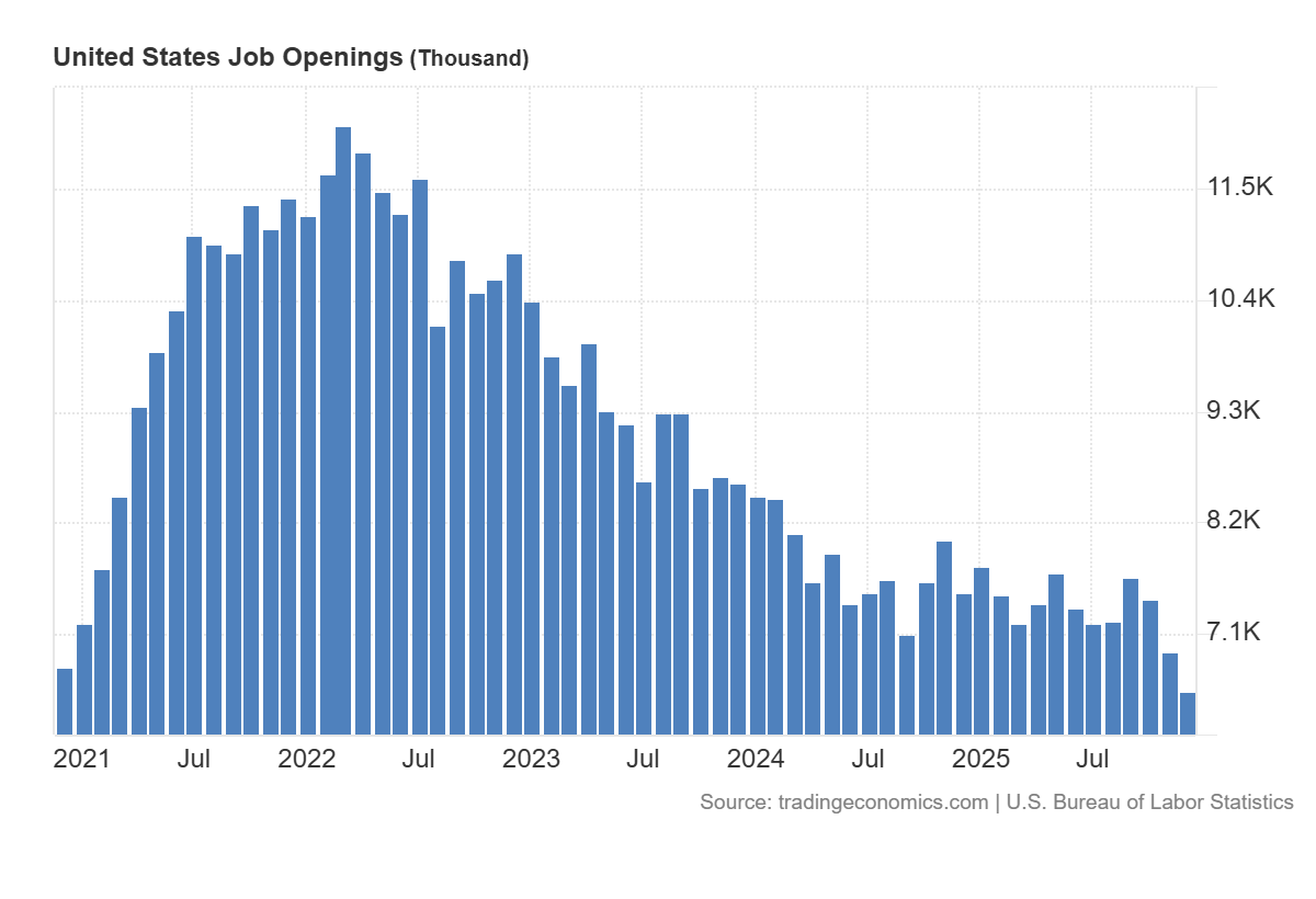 The Trend: We are now effectively back to pre-pandemic levels, having erased the entire “excess demand” bubble of 2021–2022. At its peak, there were nearly 12 million open roles. That number has been cut almost in half.